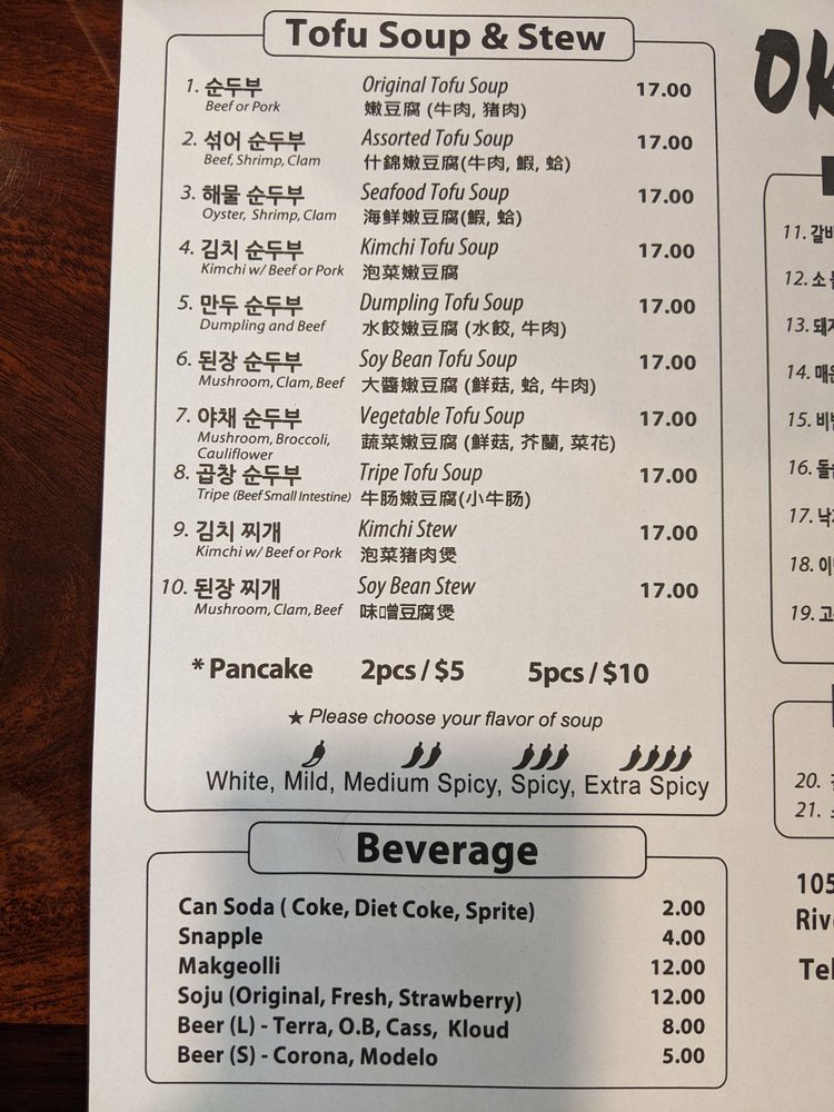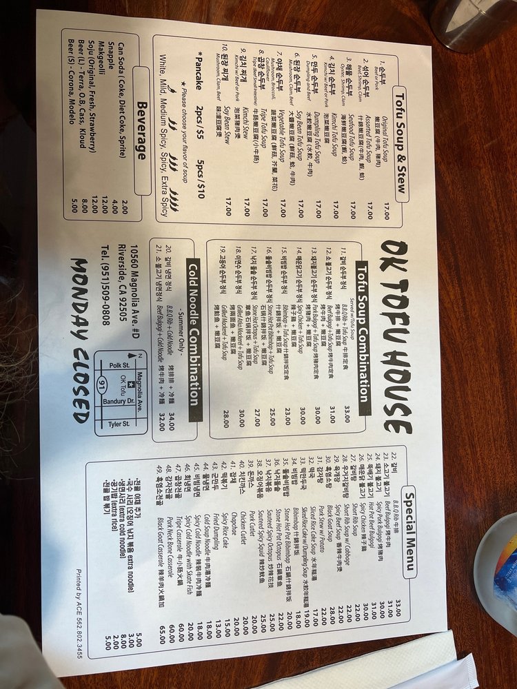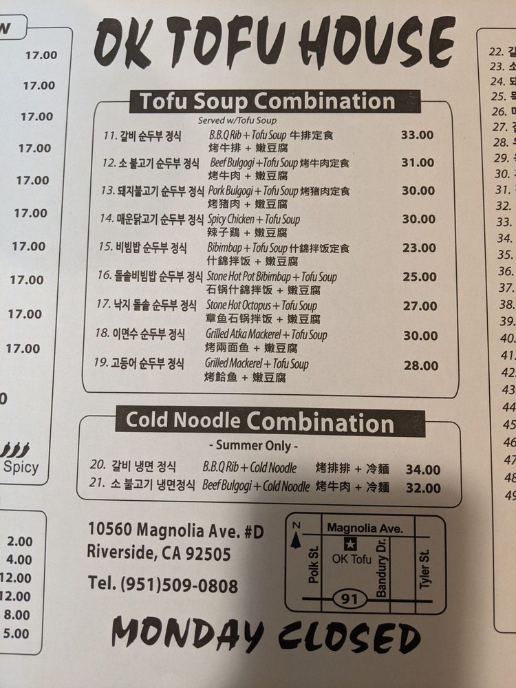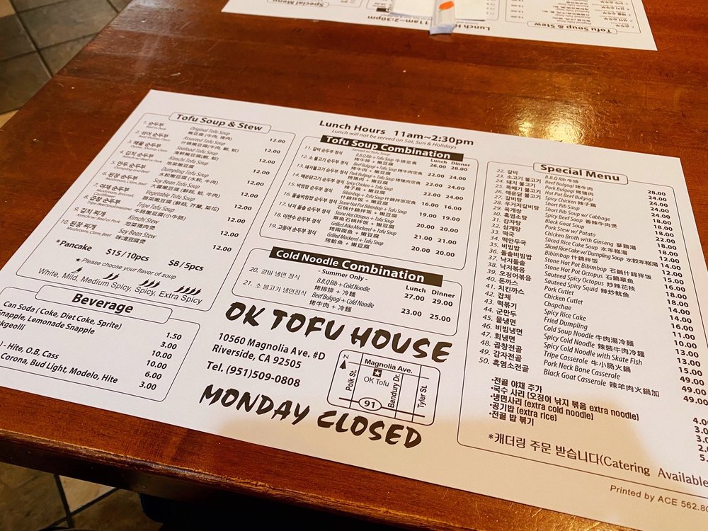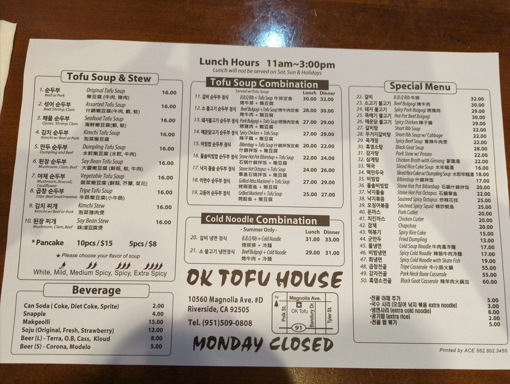 Introducing OK Tofu House, a cozy Korean restaurant located in Riverside, CA. Specializing in noodles and soups, this spot offers a range of options including seafood tofu soup, spicy chicken, and bibimbap. Customers rave about the rich flavors of dishes like the potato pork soup and the beef tofu soup. The ambiance is inviting with K-pop music playing in the background, creating a relaxed dining experience. The service is attentive and the staff go above and beyond to ensure a pleasant meal. Don't miss out on their delicious banchan and authentic Korean pancakes. Whether you're craving a comforting bowl of tofu soup or a satisfying Korean meal, OK Tofu House is a must-visit for food lovers in the area. Experience a taste of Korea at this hidden gem in Riverside.
